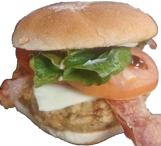 A juicy chicken burger topped with mayo, bbq, lettuce, tomato, swiss cheese and bacon.